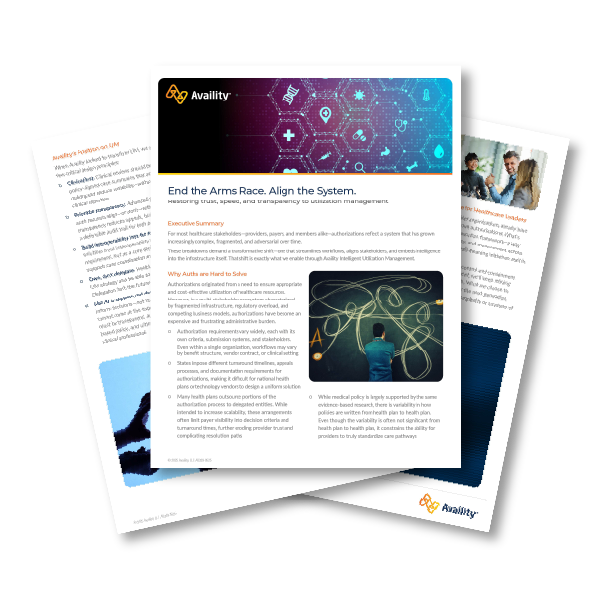 Availity is working to modernize utilization management by streamlining the prior authorization process for payers and providers. We are doing this by reducing the time utilization management clinicians must spend on cases that do not require their expertise, while helping to quickly return a decision to the provider and patient.